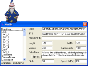 An ACS file can be opened via Command Prompt, double clicking, or through the right-click context menu. Once an ACS file is opened, a user will be able to see all the details of that Microsoft Agent character. The user may use the speak button from the extra data section to make the character speak or the animation name in the list while selecting an animation to play a character animation. Unlike the Microsoft Agent Properties Viewer, the height and width of a character cannot be set.