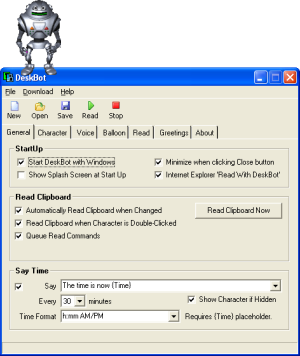 Through the options menu on the General tab, the user can have the program automatically start up with windows, hide the window of Deskbot when clicking the close button instead of exiting, show the Deskbot Splash Screen on Application Startup, or read pages with internet explorer with Deskbot. The user can also read their current clipboard on command, or customize how Deskbot announces time.