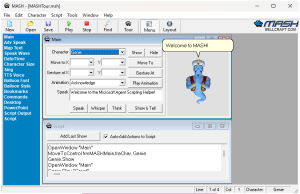 Screenshot of the MASHTour.MSH script being ran in the Microsoft Agent Scripting Helper. | |