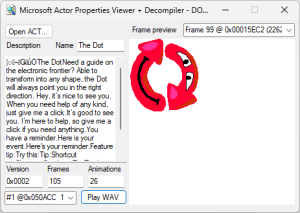 The program features an "Open ACT..." button that can be used to select an .ACT file. Once an .ACT file is loaded, a user will be able to see all the available details of the Microsoft Actor character, with the program automatically decompiling all frames and sounds in the same directory the Actor was selected in.